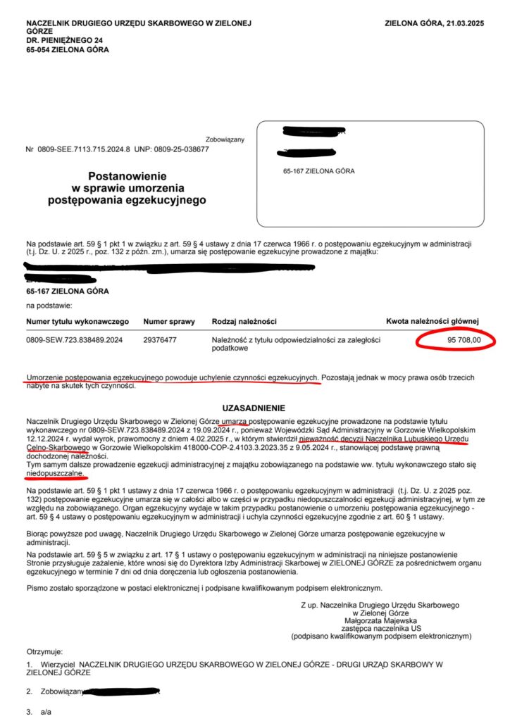 Egzekucja na kwotę 95 tysięcy- umorzona