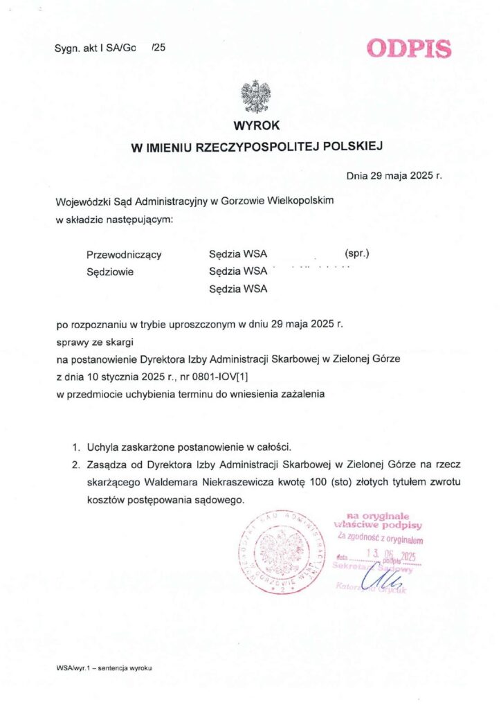 WSA w Gorzowie uchylił postanowienie Dyrektora Izby Administracji Skarbowej w Zielonej Górze, który niesłusznie uznał zażalenie za spóźnione. Sąd potwierdził, że organ działał nieprawidłowo i zasądził zwrot kosztów postępowania. To dowód, że dzięki wsparciu naszej Fundacji można skutecznie walczyć z błędnymi decyzjami urzędów.